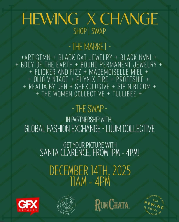 Hewing xChange, 11:00 AM at Hewing Hotel, Minneapolis – Celebrate sustainable style with shopping, swapping, treats, and a festive Santa photo opportunity.